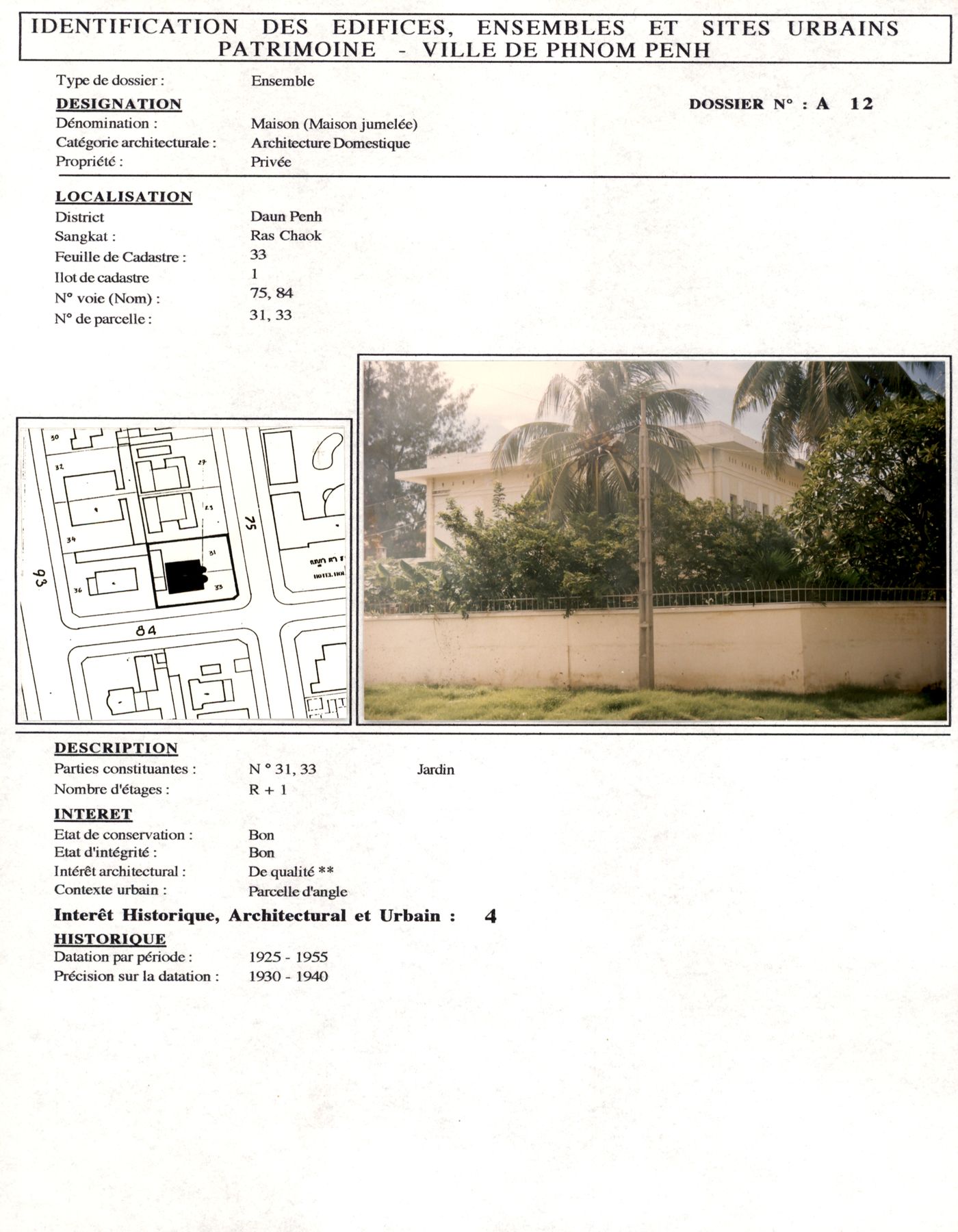 Ville de Phnom Penh : étude du patrimoine urbain - Fiches d'identification patrimoine architectural et urbain - Dossiers de A1 à A100 (secteur Khan Daun Penh) - 1993-1996