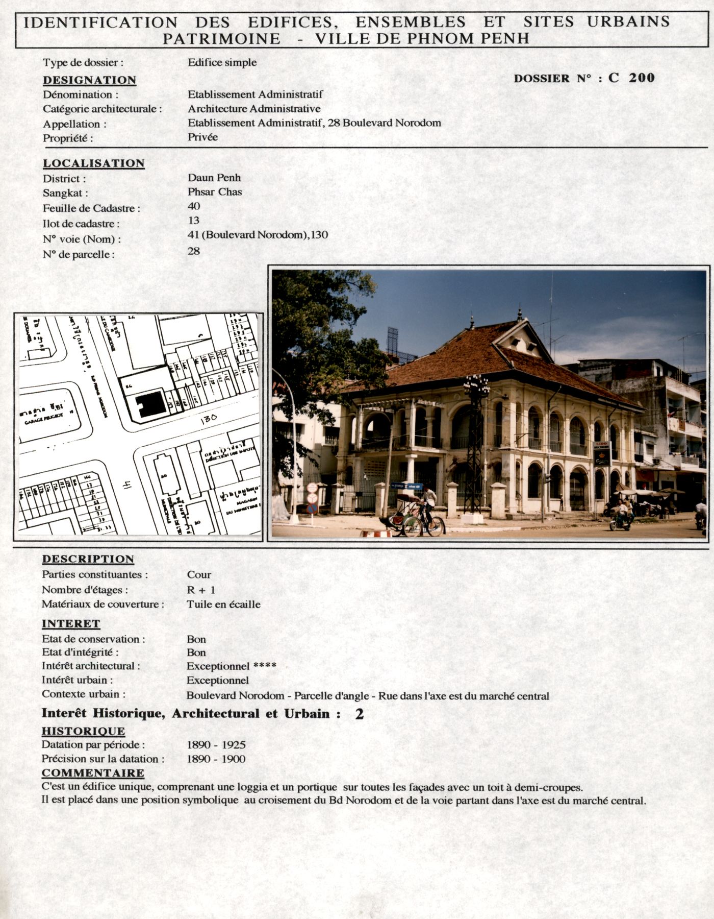 Ville de Phnom Penh : étude du patrimoine urbain - Fiches d'identification patrimoine architectural et urbain - Dossiers de C200 à C251 (secteur Khan Daun Penh) - 1993-2000