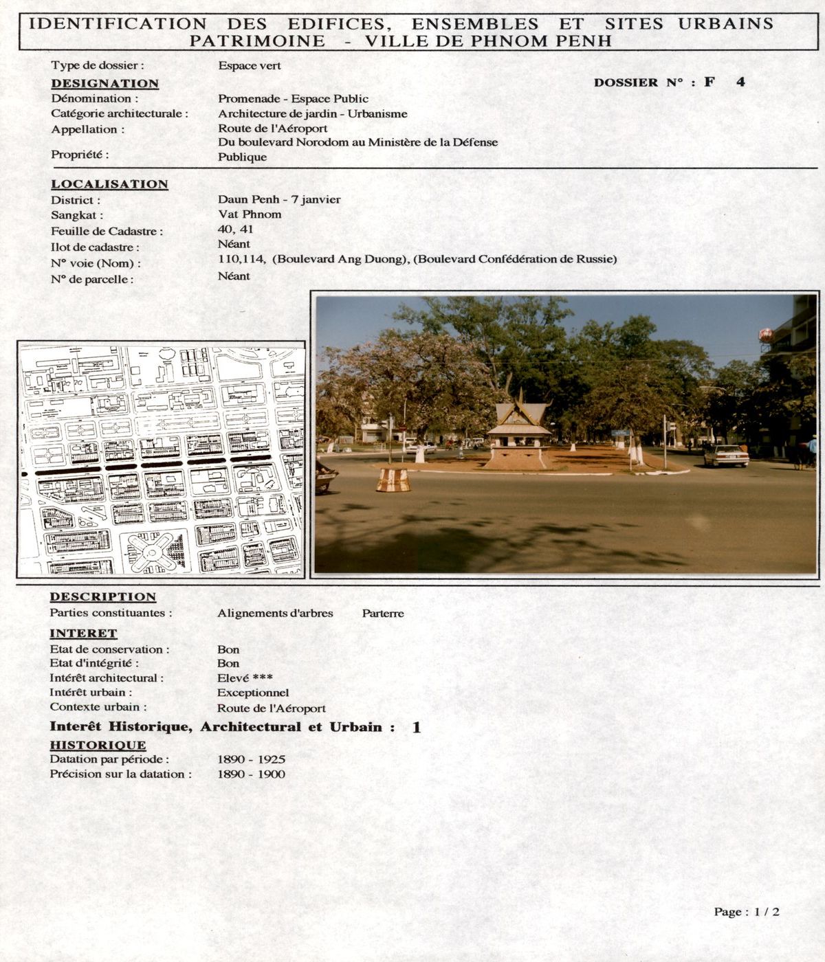 Ville de Phnom Penh : étude du patrimoine urbain - Fiches d'identification patrimoine architectural et urbain - Dossiers de F1 à F18 (secteur Khan Daun Penh) - 1993-2003
