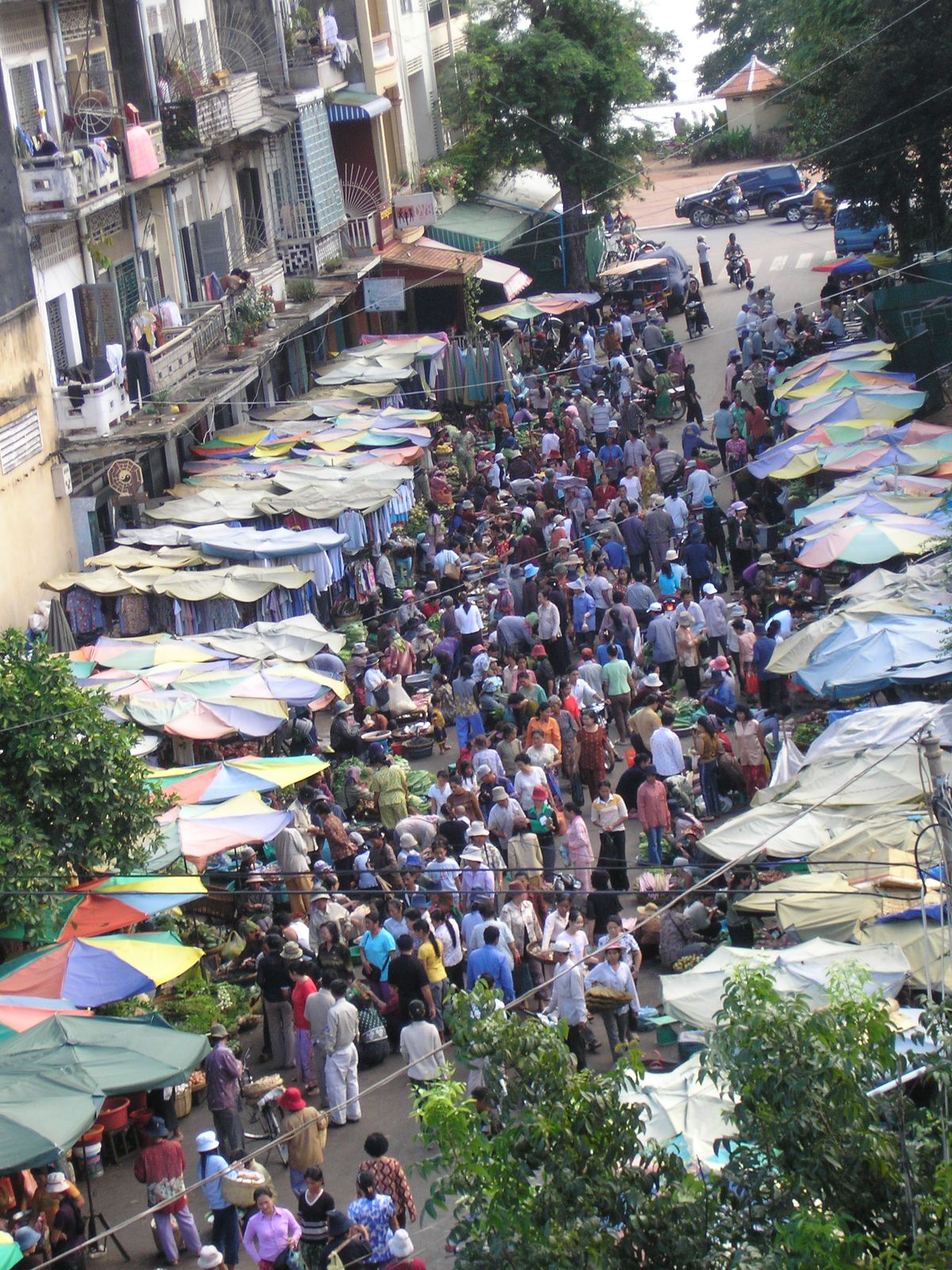 Phnom Penh : point de vue sur le marché Kandal (Psar Kandal,) vue depuis la rue 13 et le quai Sisovath, étalages et affluence des clients en 2005 © Apur