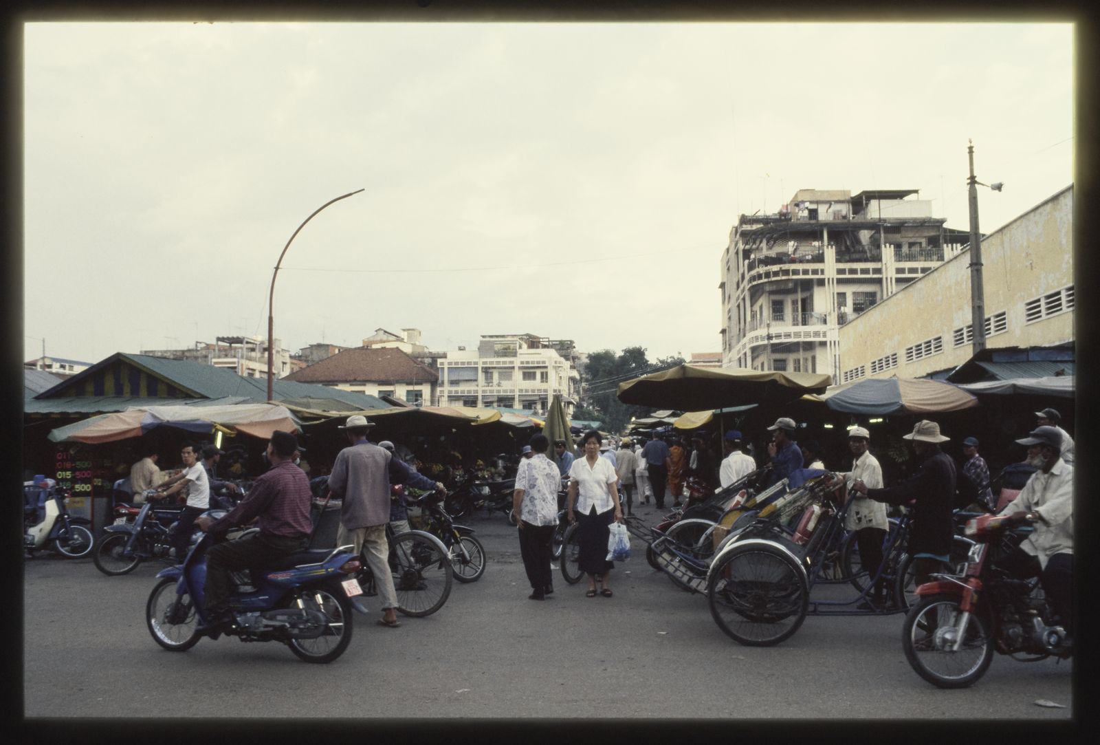 Phnom Penh : marché Kandal en 2001, étalages à l'extérieur et circulation cyclomoteurs © Apur