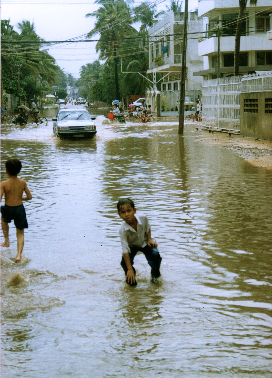Inondations à Phnom Penh en 1995, enfants jouant dans l'eau © Apur- F. Objois