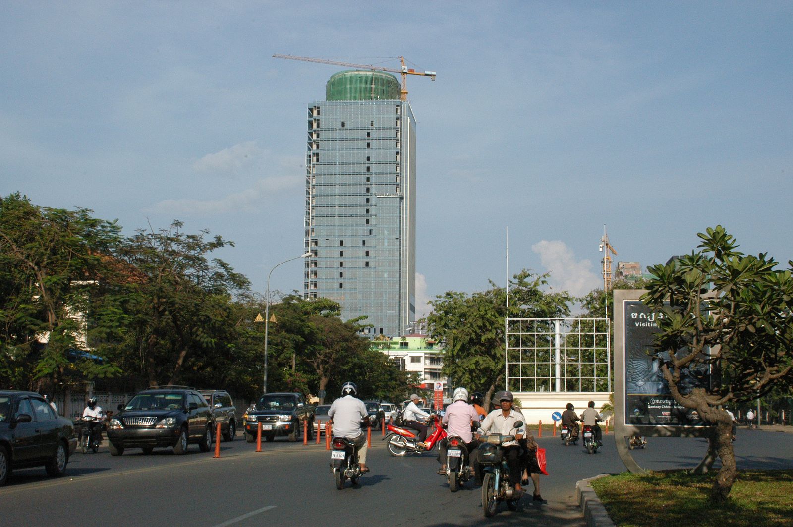 Circulation dans le secteur de la Confédération de Russie, vue sur la première tour de la canadian bank en construction à Phnom Penh en 2009 © Apur - Delphine Liévin