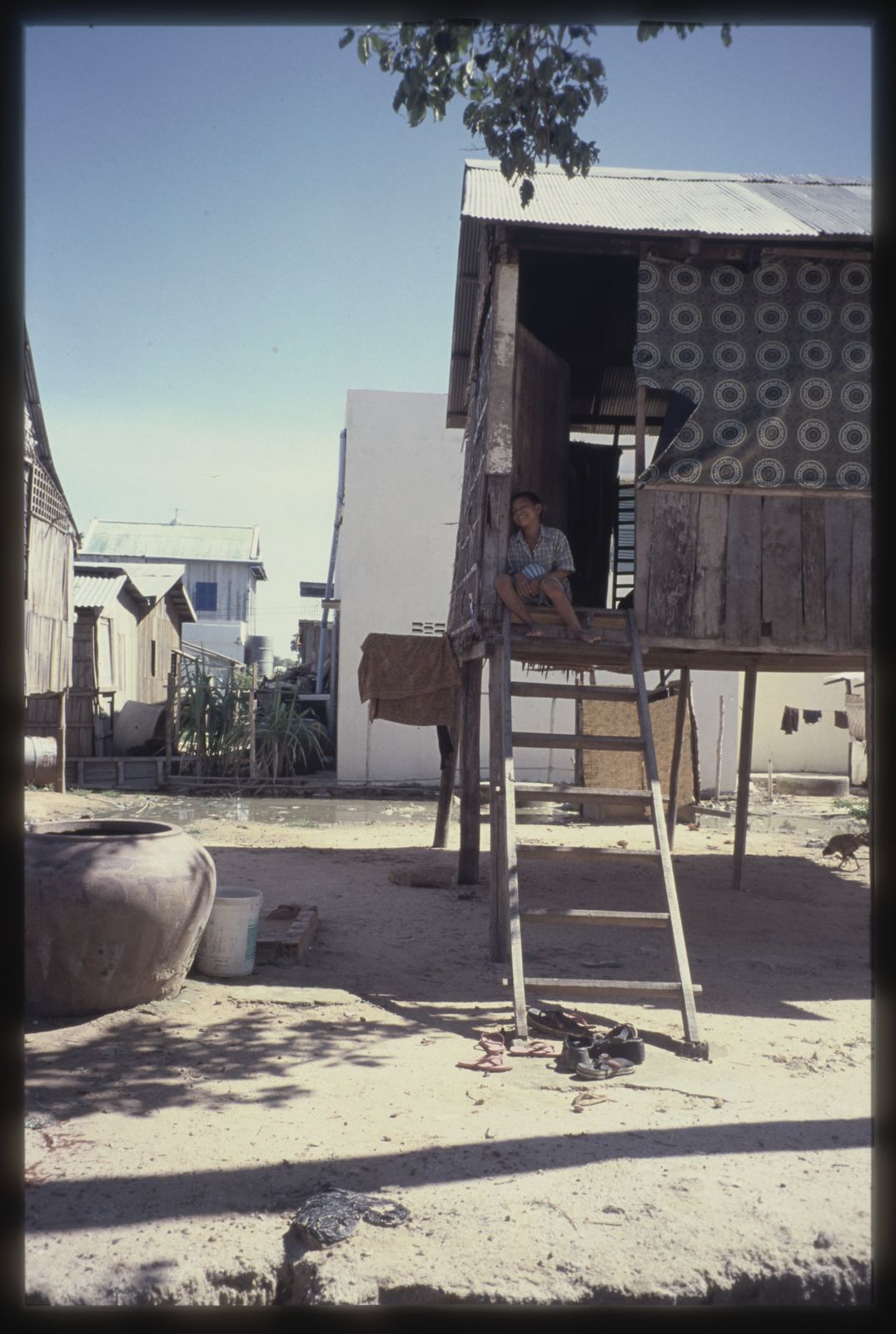 Phnom Penh : site de relogement Prek Ti Toum, maison traditionnelle, en 2002 © Apur