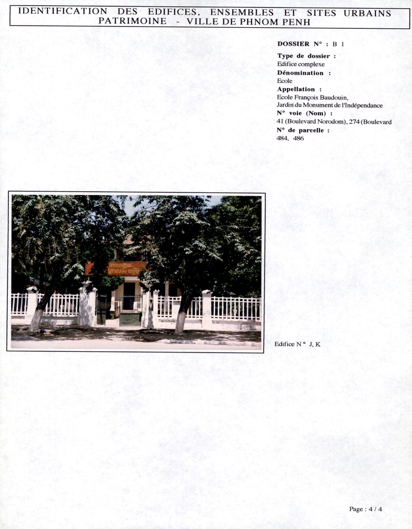 Ville de Phnom Penh : étude du patrimoine urbain - Fiches d'identification patrimoine architectural et urbain - Dossiers de B1 à B129 (secteur Khan Daun Penh) - 1993-1996
